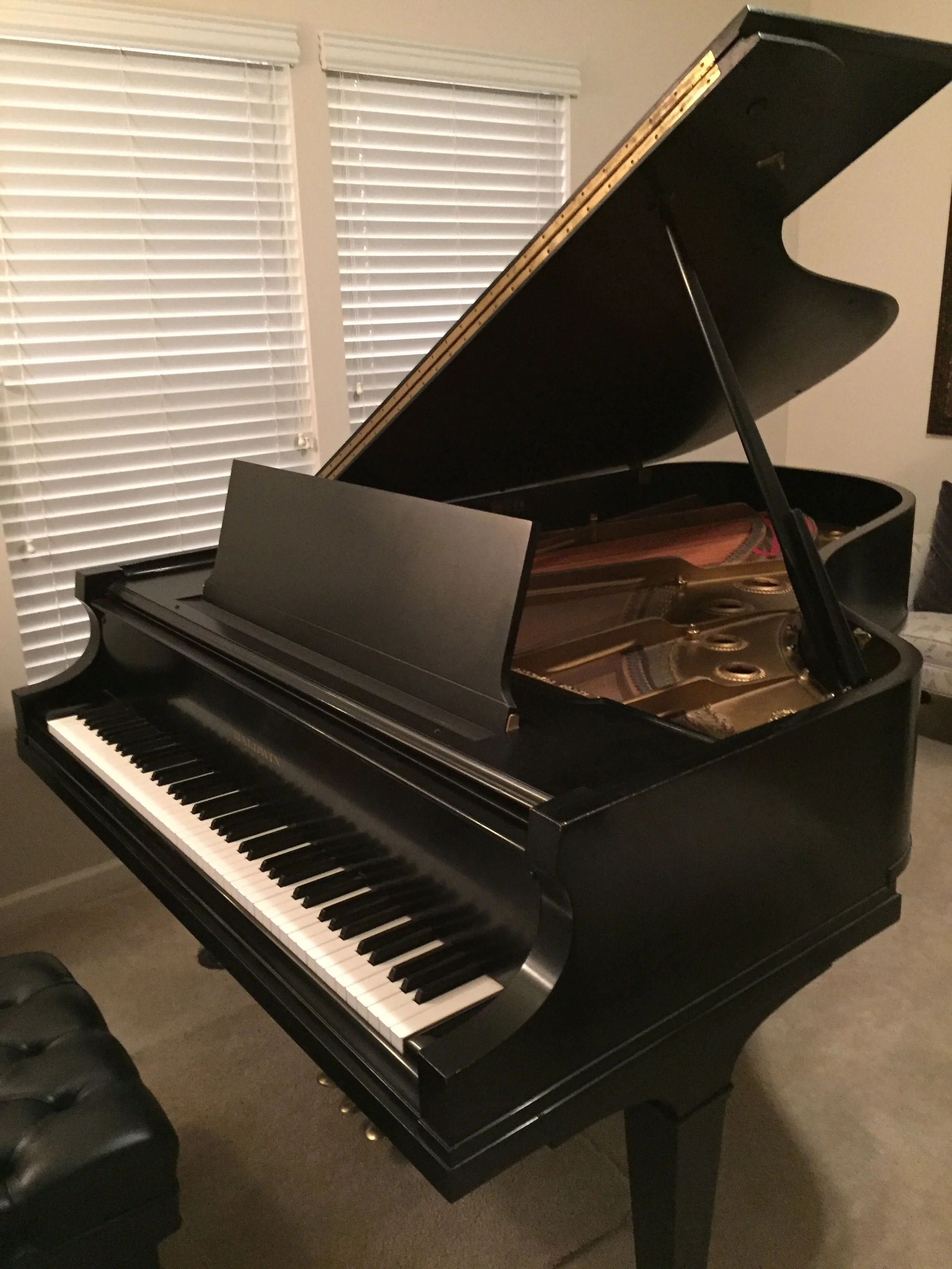 Most recently, following our move to the Liberty Township area in September of 2020, the hammers on the Baldwin were sanded and voiced, yielding a much more rounded mellow tone.